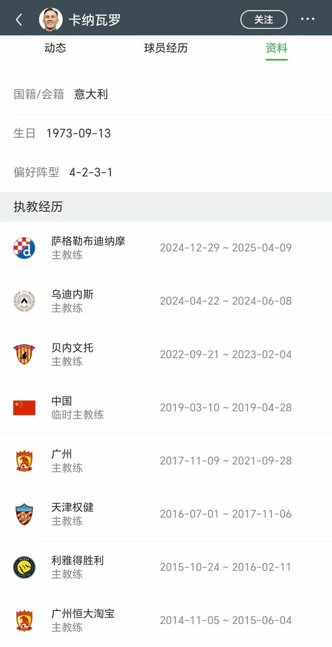卡纳瓦罗离开中国后,三次在欧洲拿起教鞭,执教都没有超过5个月。