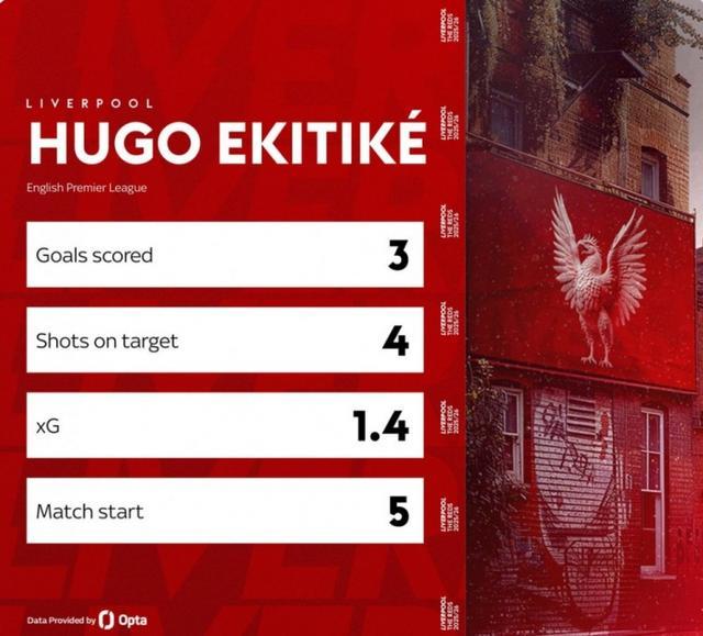 埃基蒂克加盟利物浦以来5场英超皆首发,射正4次打进3球