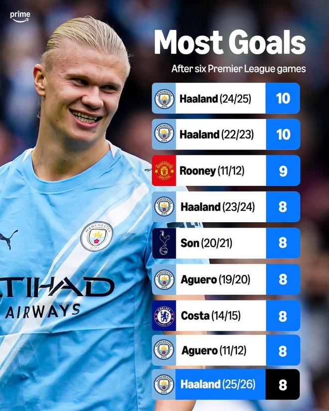 英超9次有球员赛季前6场进球8+,哈兰德独占4次