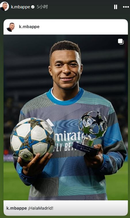 赛后,姆巴佩也当选本场比赛最佳球员,他在社媒也晒出自己领取MVP奖杯照片,并配文:“Hala Madrid!(加油,马德里)”